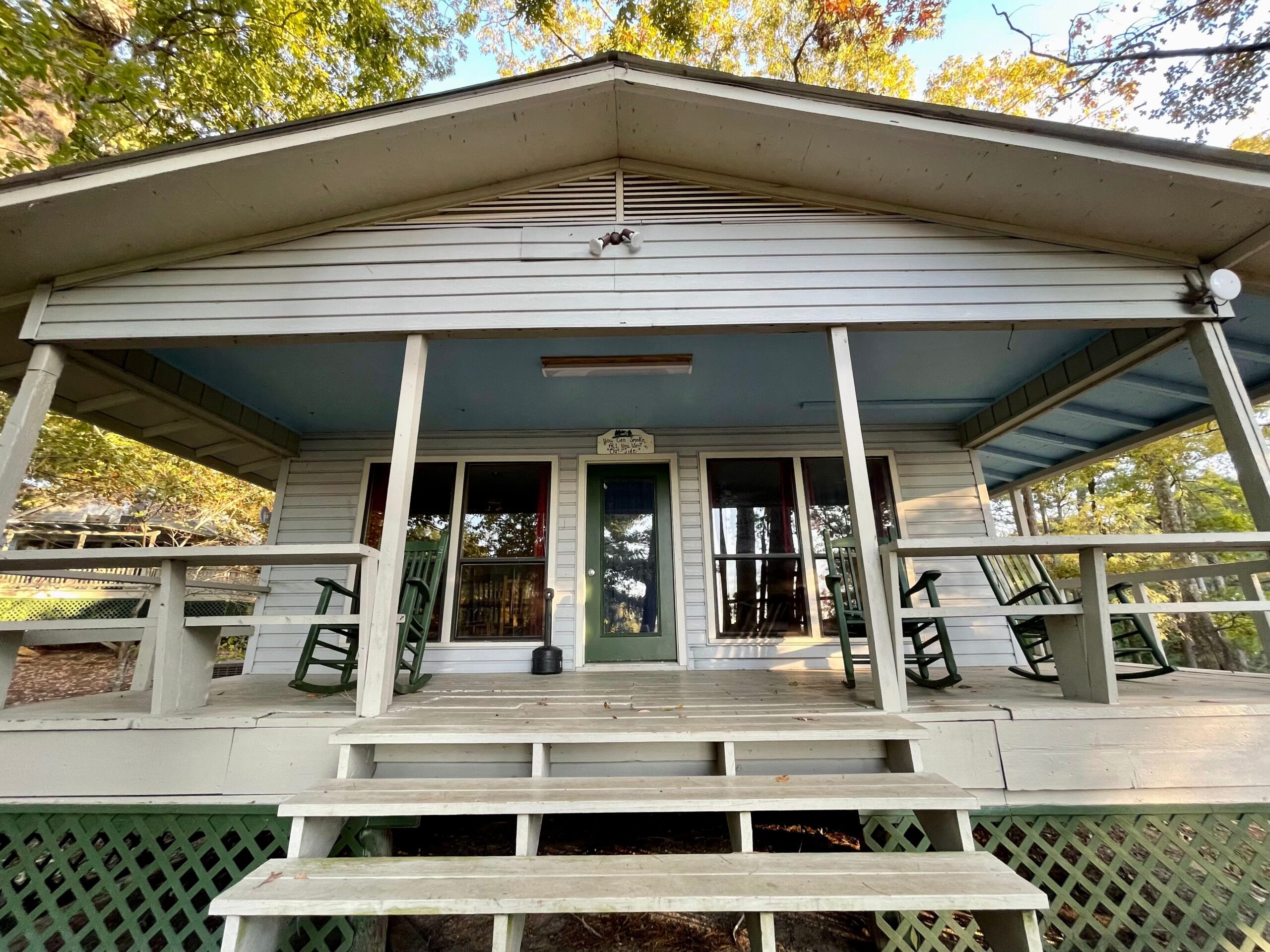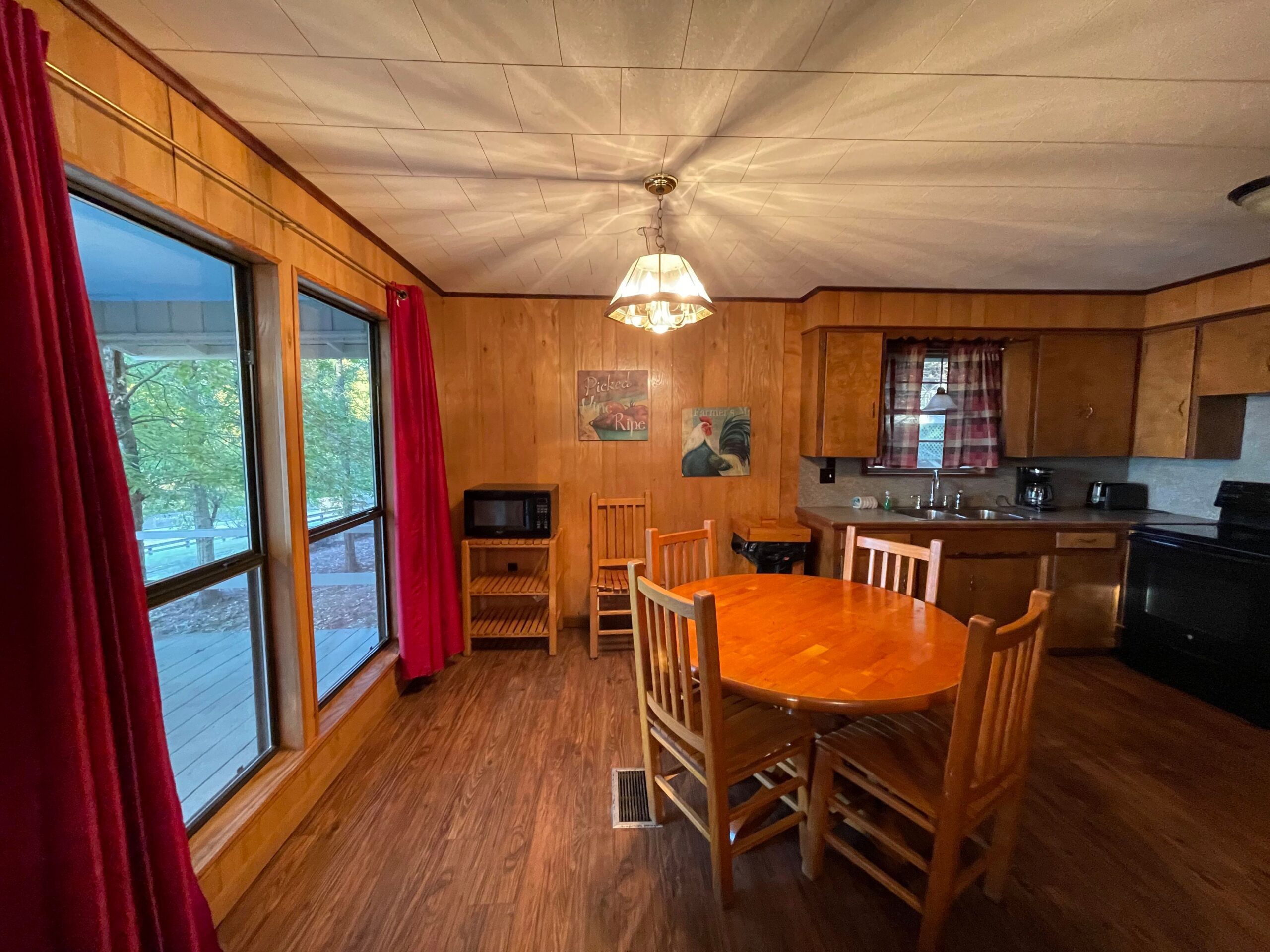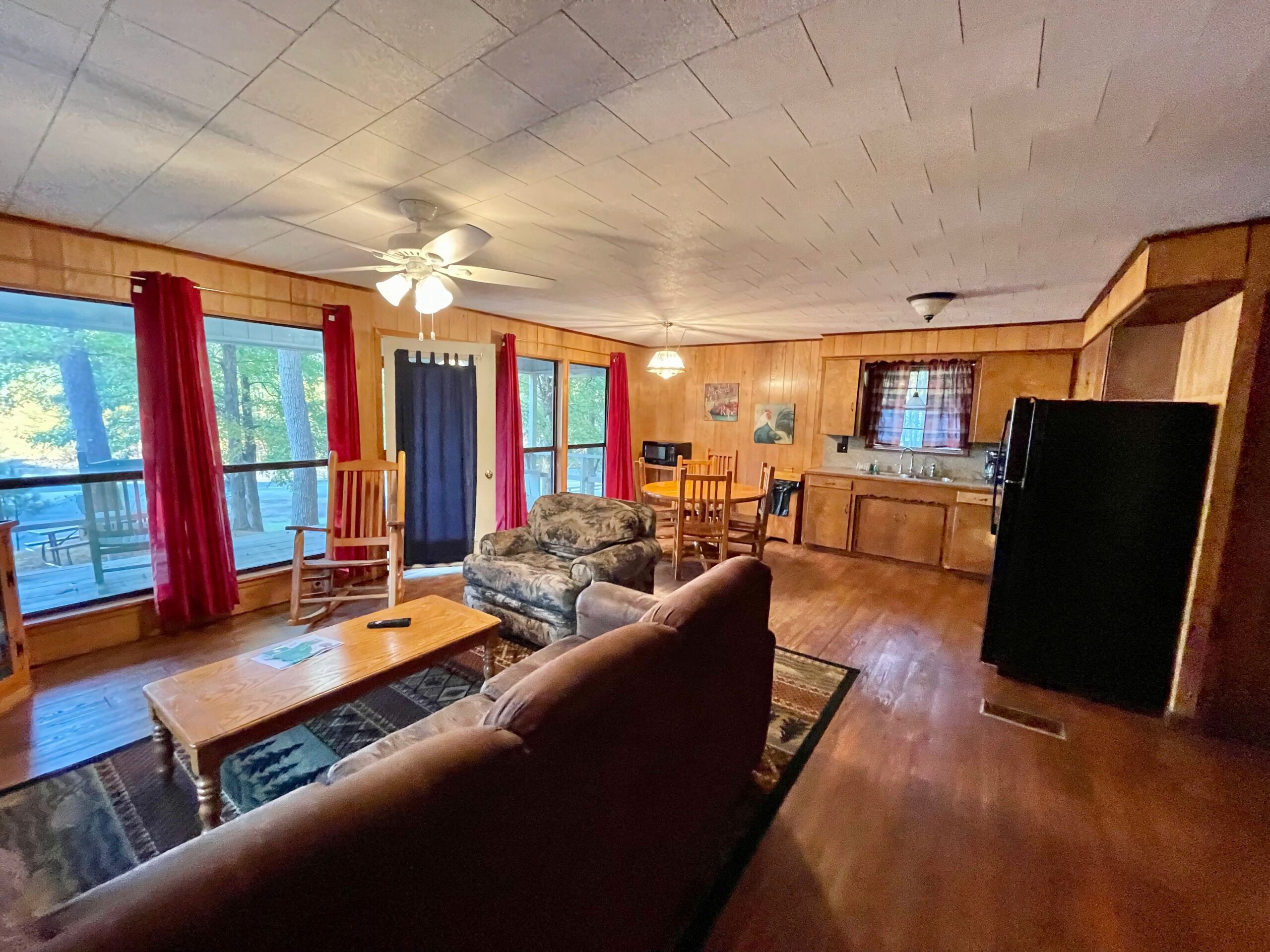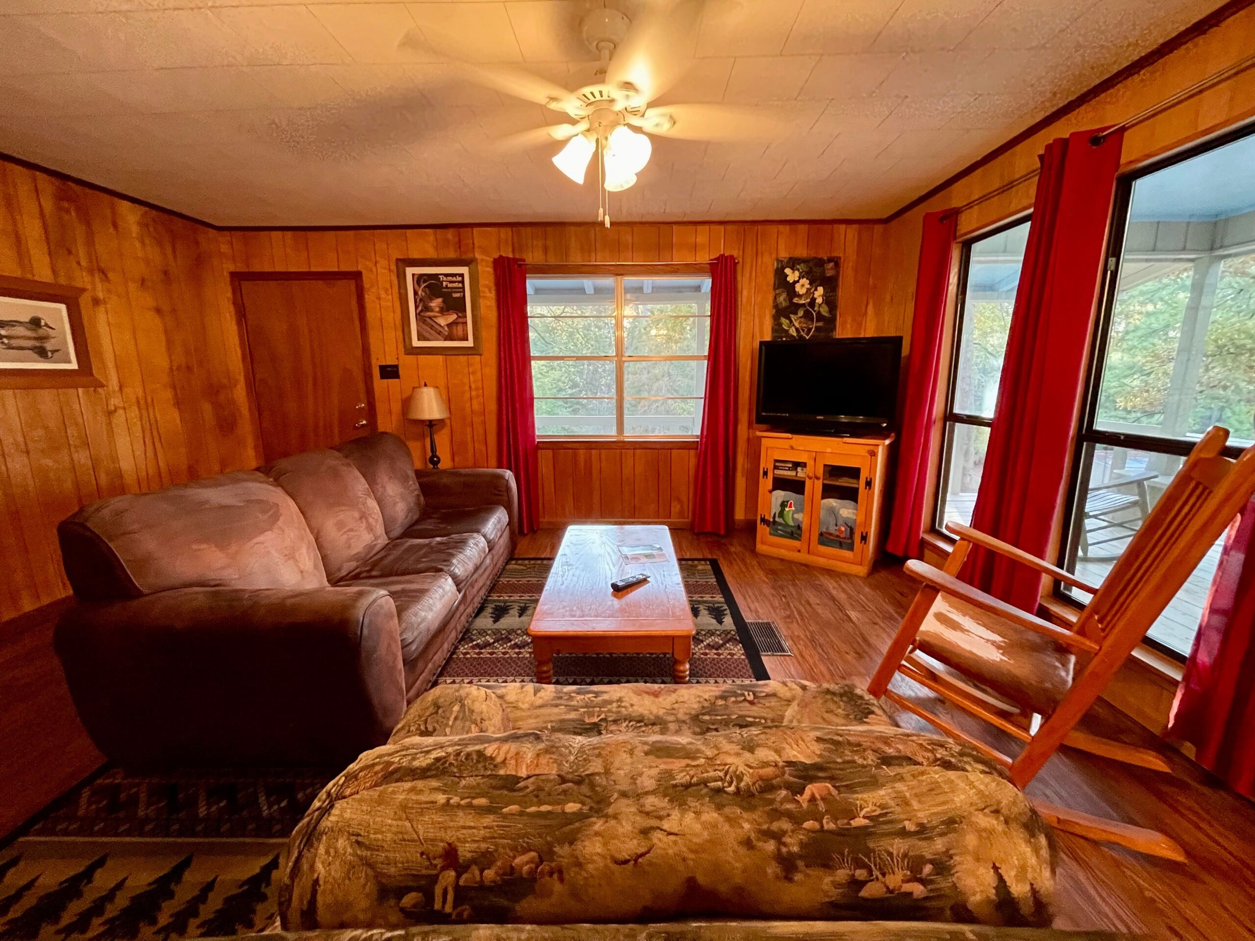 One Full Size Bathroom with Tub/Shower, Towels/Linens/Bath Tissue Provided, Fully Equipped Kitchen, Dining Area, Large Great Room, Cable TV, Complimentary Wi-Fi, Comfortable Rocking Chairs on covered front porch that overlooks Lake/Fishing Pier/Boat Launch, Outdoor BBQ Pit / Fire Pit / Picnic Table, Easy Parking