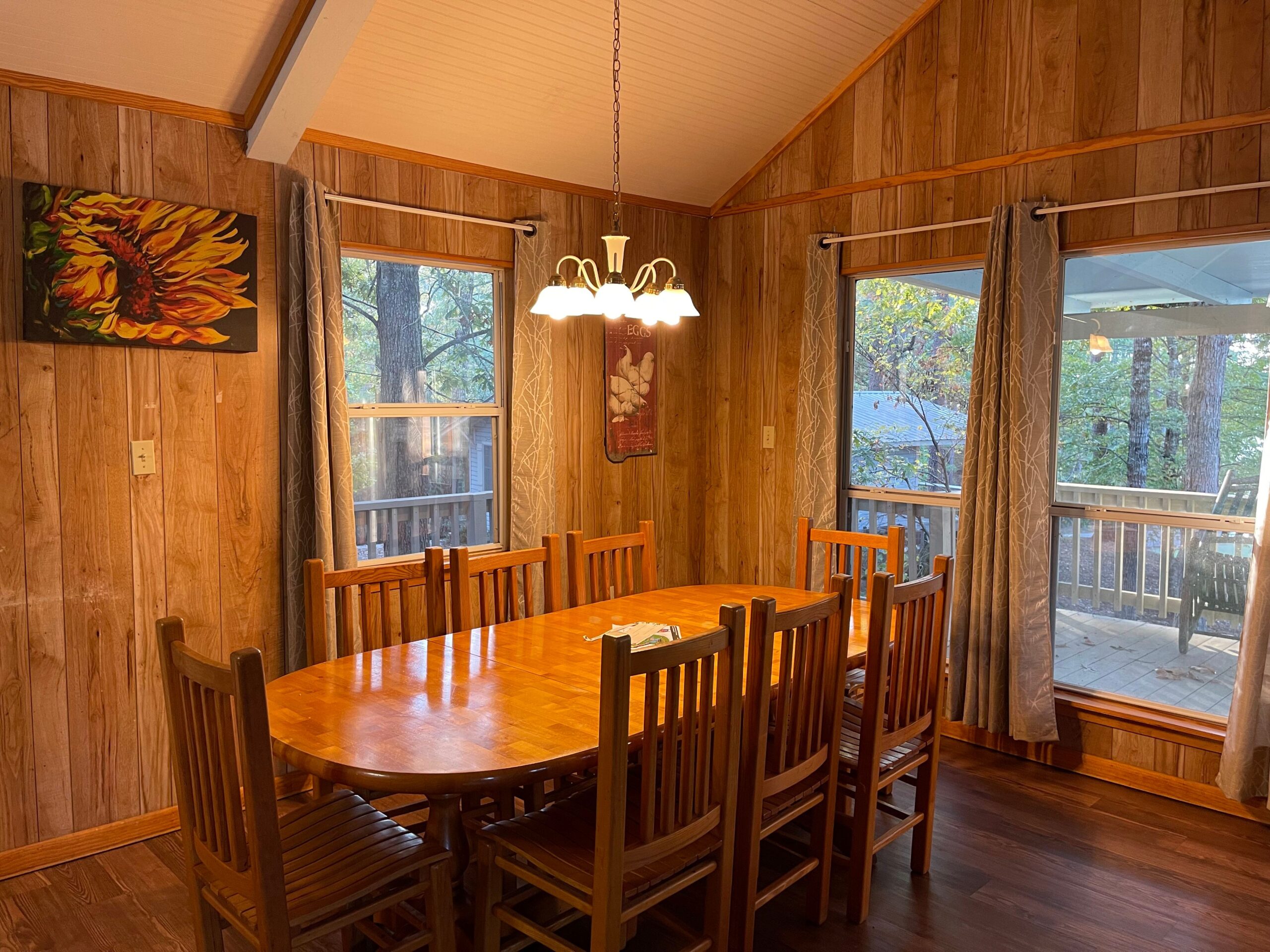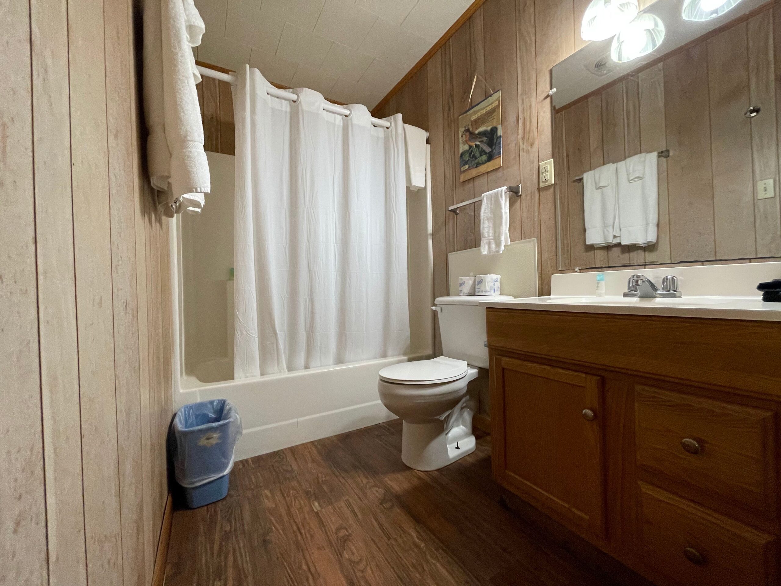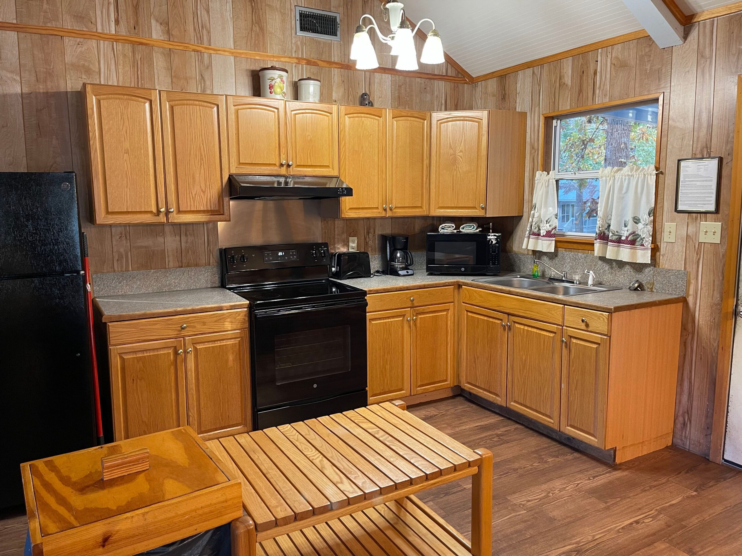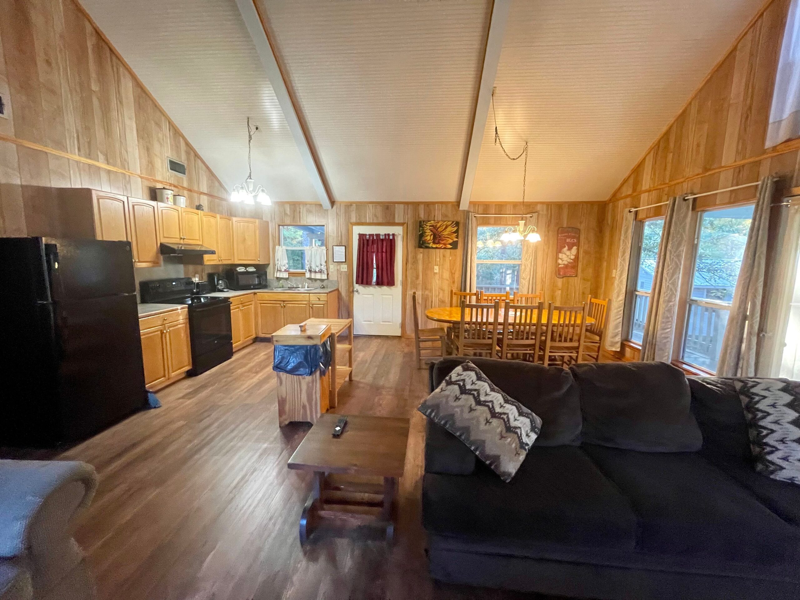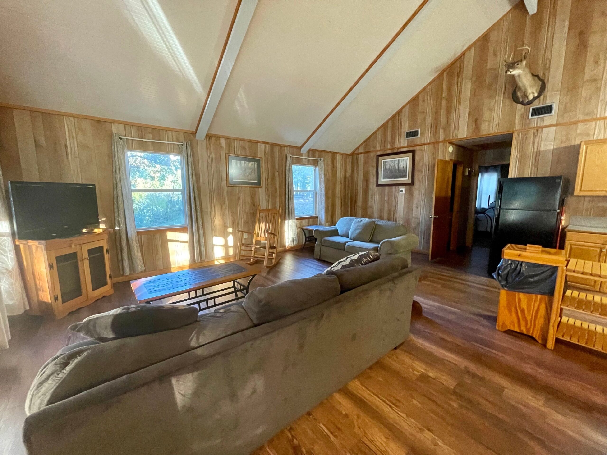 One Full Size Bathroom with Tub/Shower, Towels/Linens/Bath Tissue Provided, Fully Equipped Kitchen, Dining Area, Spacious Great Room with Vaulted Ceiling, Cable TV, Complimentary Wi-Fi, Comfortable Rocking Chairs on covered front porch that overlooks Lake/Fishing Pier/Boat Launch, Outdoor BBQ Pit / Fire Pit / Picnic Table, Easy Parking