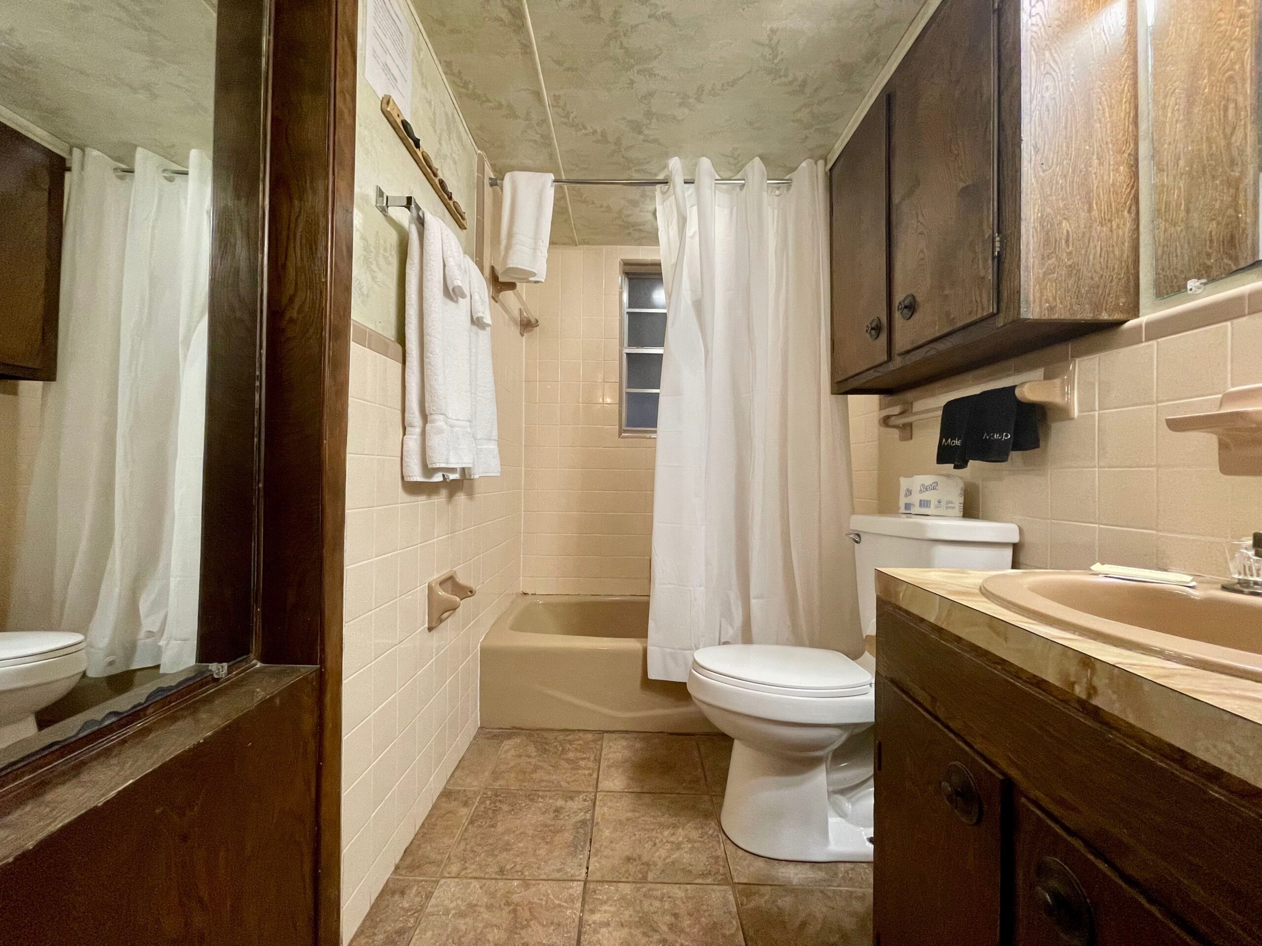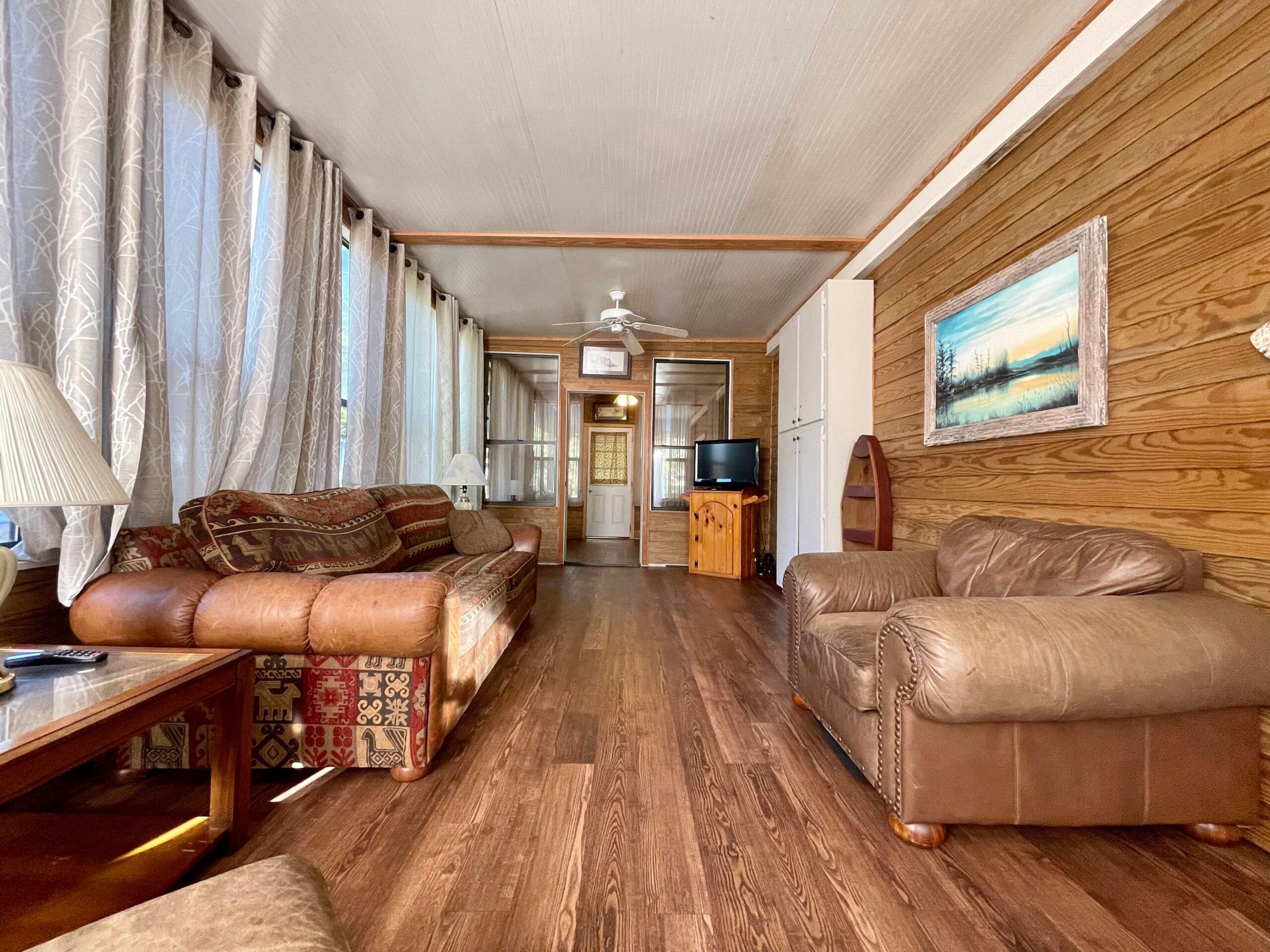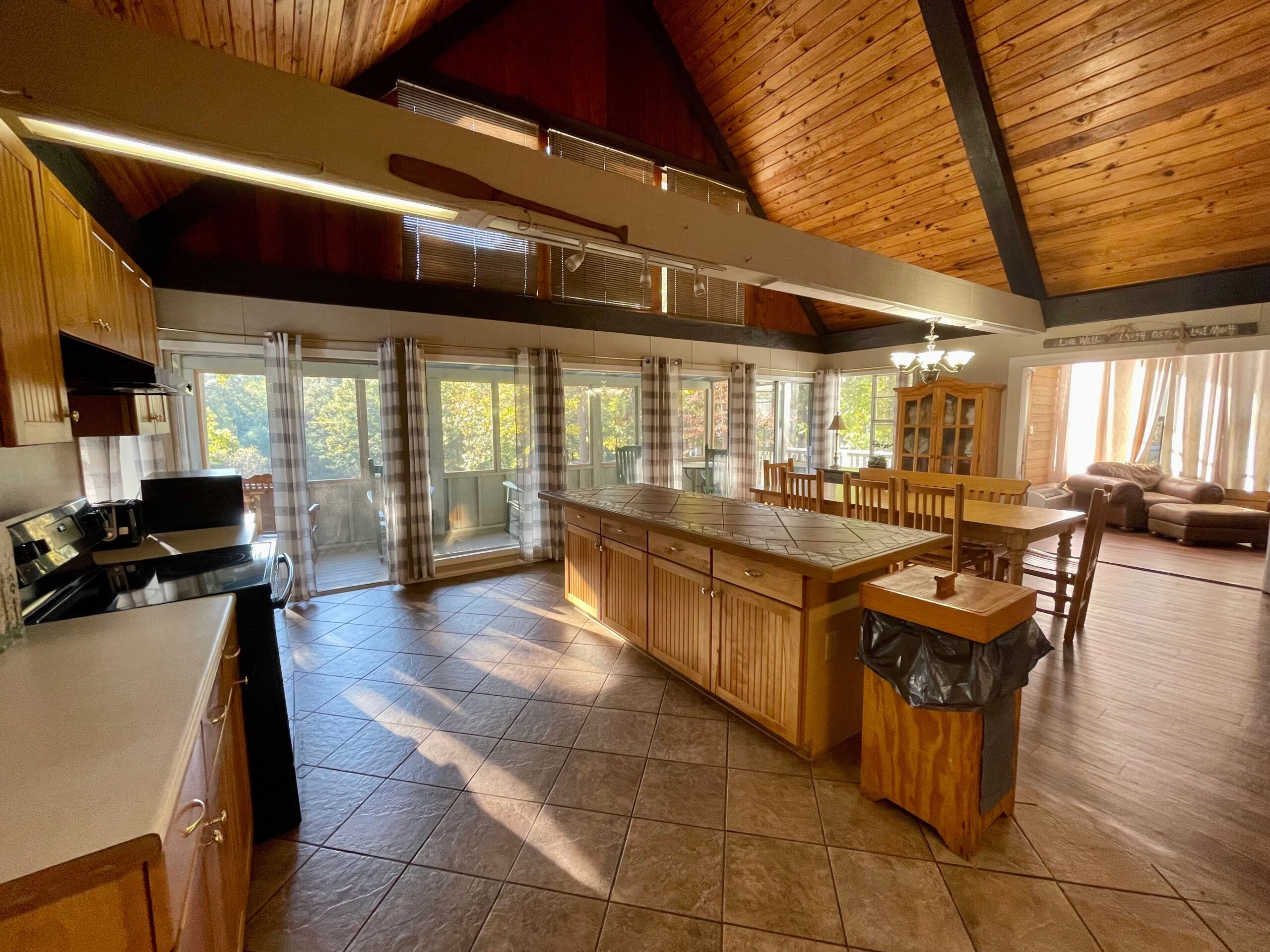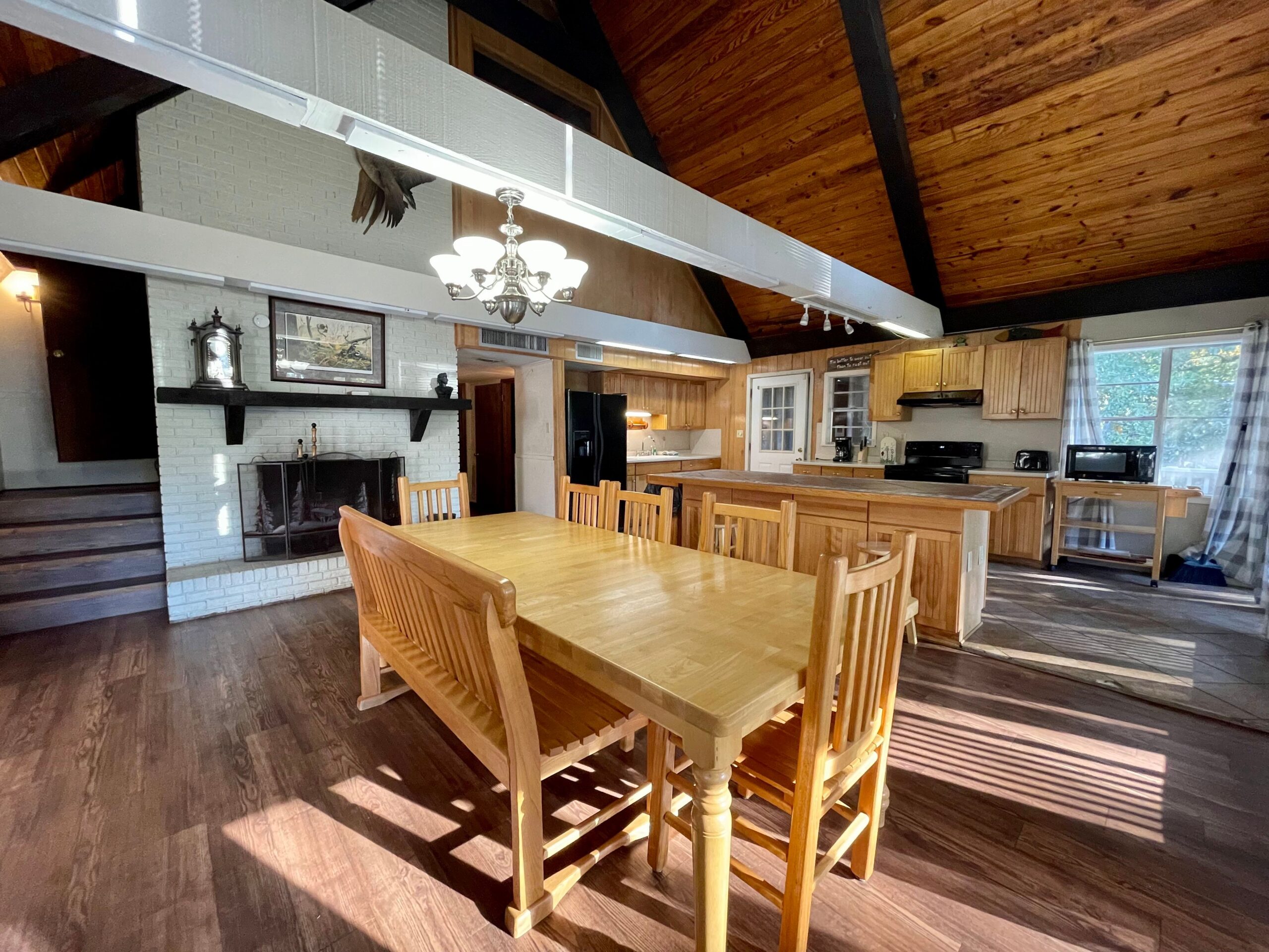 Towels/Linens/Bath Tissue Provided, Fully Equipped Kitchen with Large Island, Large Dining Area with Vaulted Ceilings, Sitting Area, Wood Burning Fireplace, Cable TV, Complimentary Wi-Fi, Comfortable Rocking Chairs on very generous covered Front Porch, Comfortable Rocking Chairs on screened & covered Back Porch, Outdoor BBQ Pit / Fire Pit / Picnic Table, Easy Parking