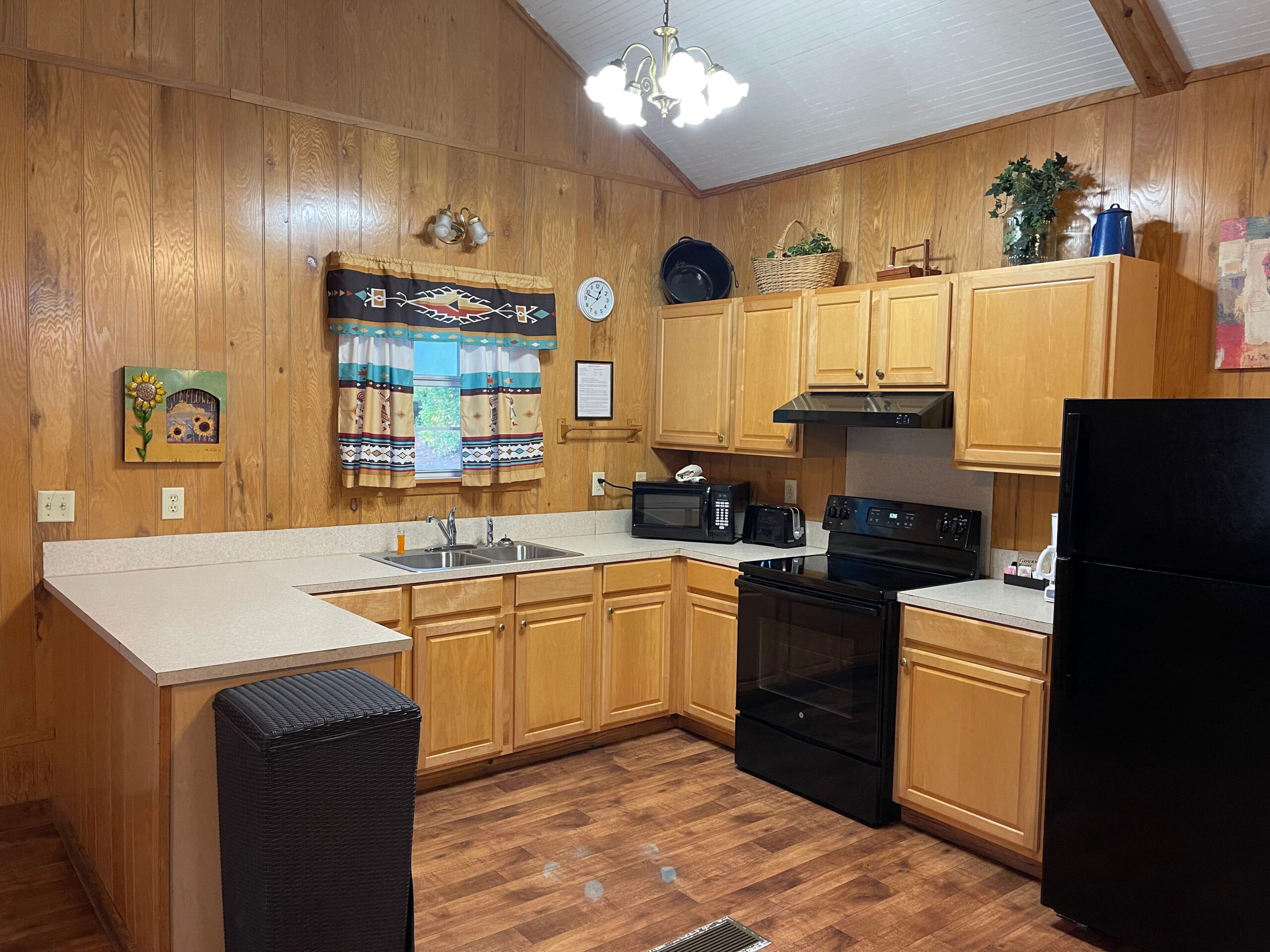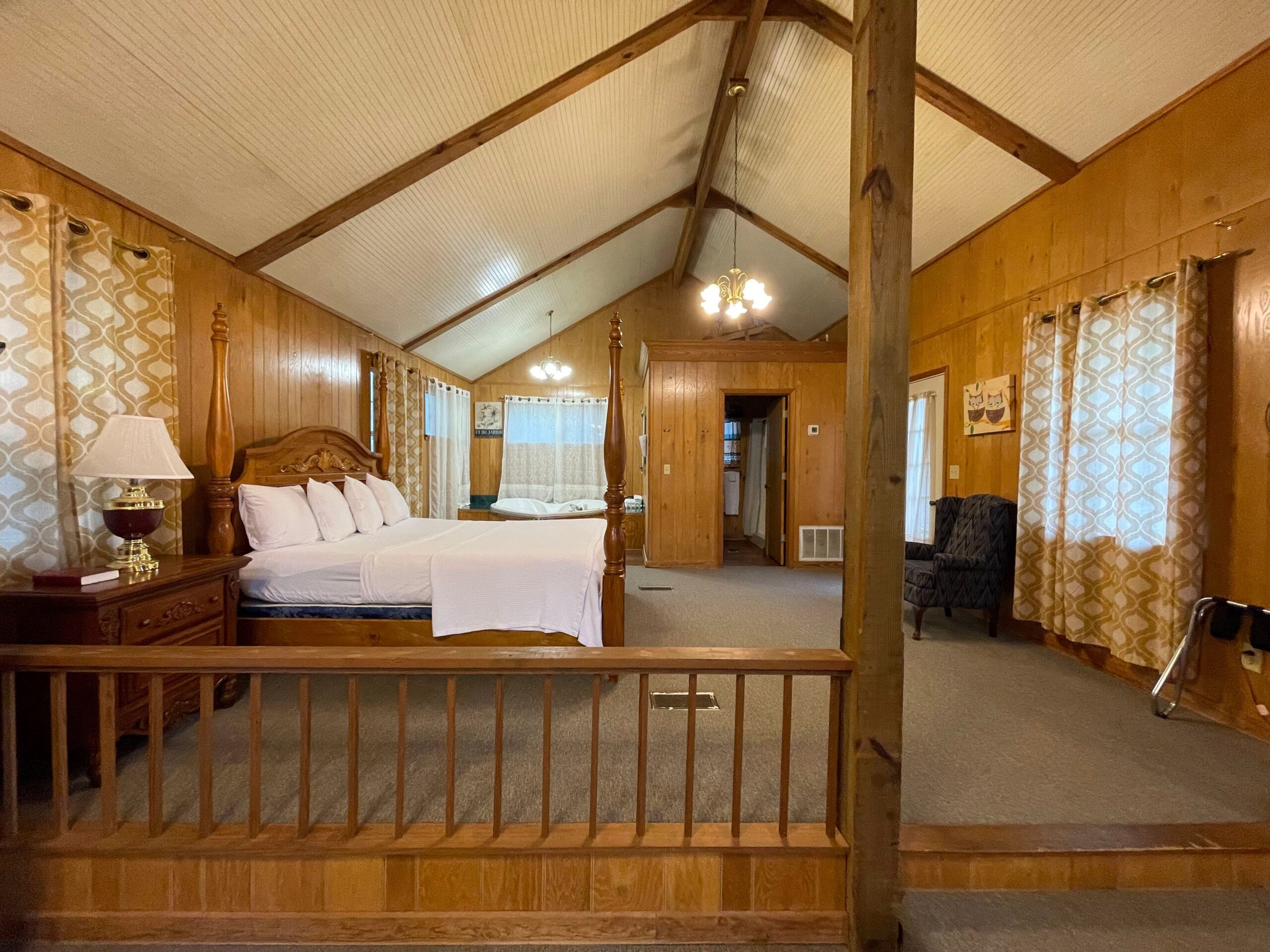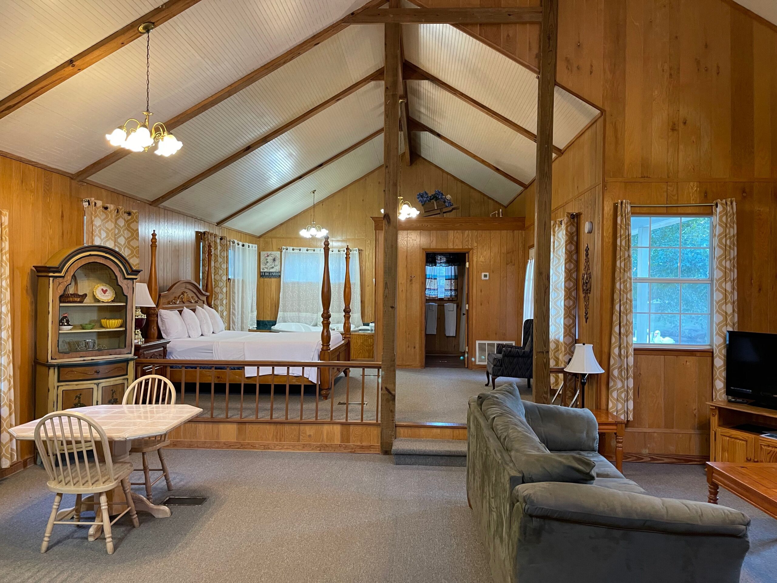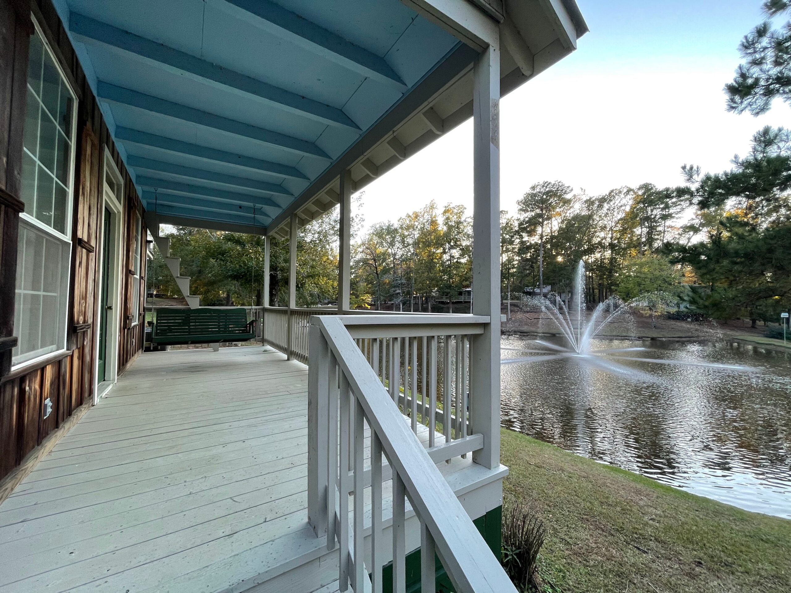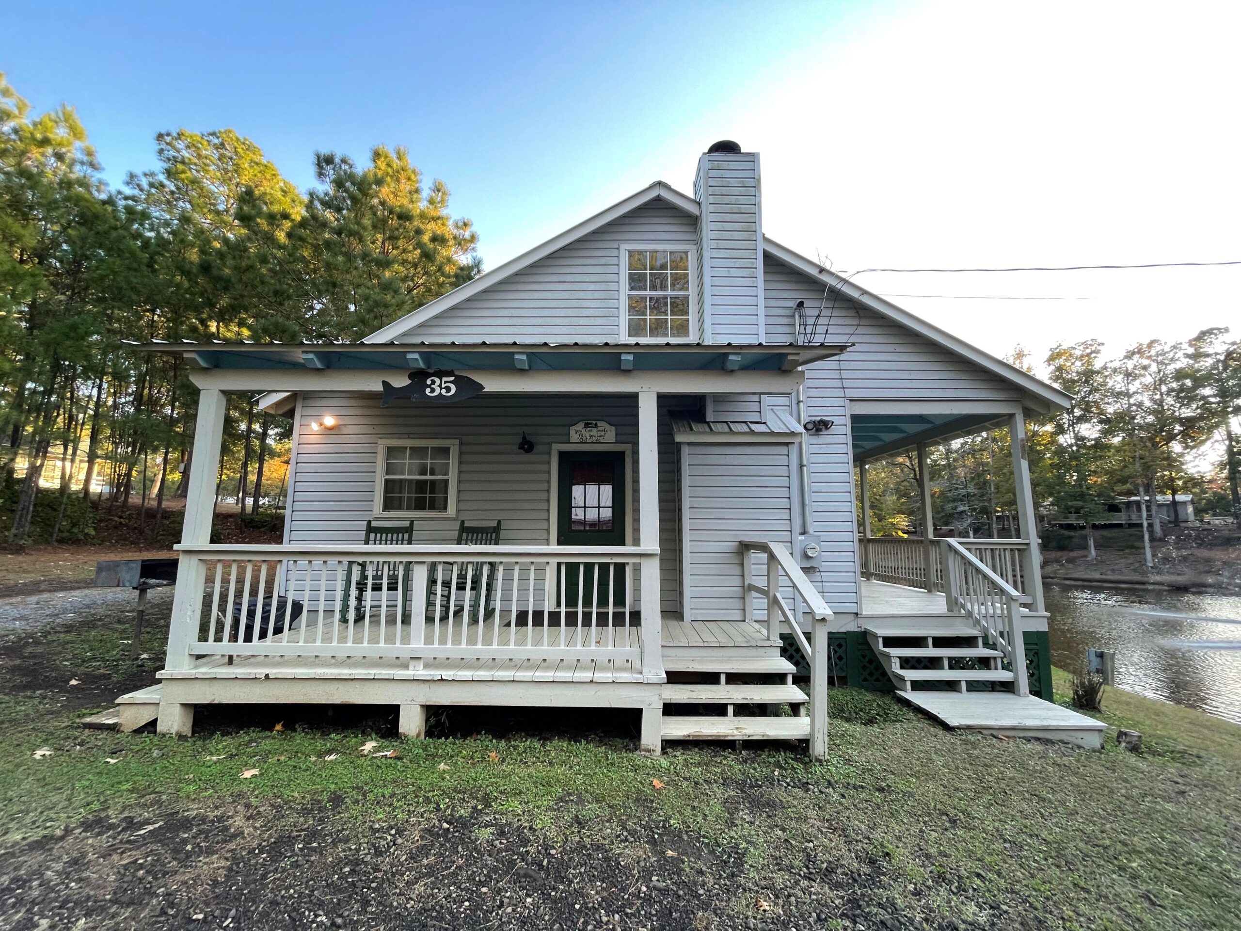 Towels/Linens/Bath Tissue Provided, Fully Equipped Kitchen, Dining Area, Sitting Area, Wood Burning Fireplace, Vaulted, Ceiling, Cable TV, Complimentary Wi-Fi, Comfortable Rocking Chairs & Bench Swing on covered porch overlooking a private stocked pond with large water fountain, Outdoor BBQ Pit / Fire Pit / Picnic Table, Easy Parking