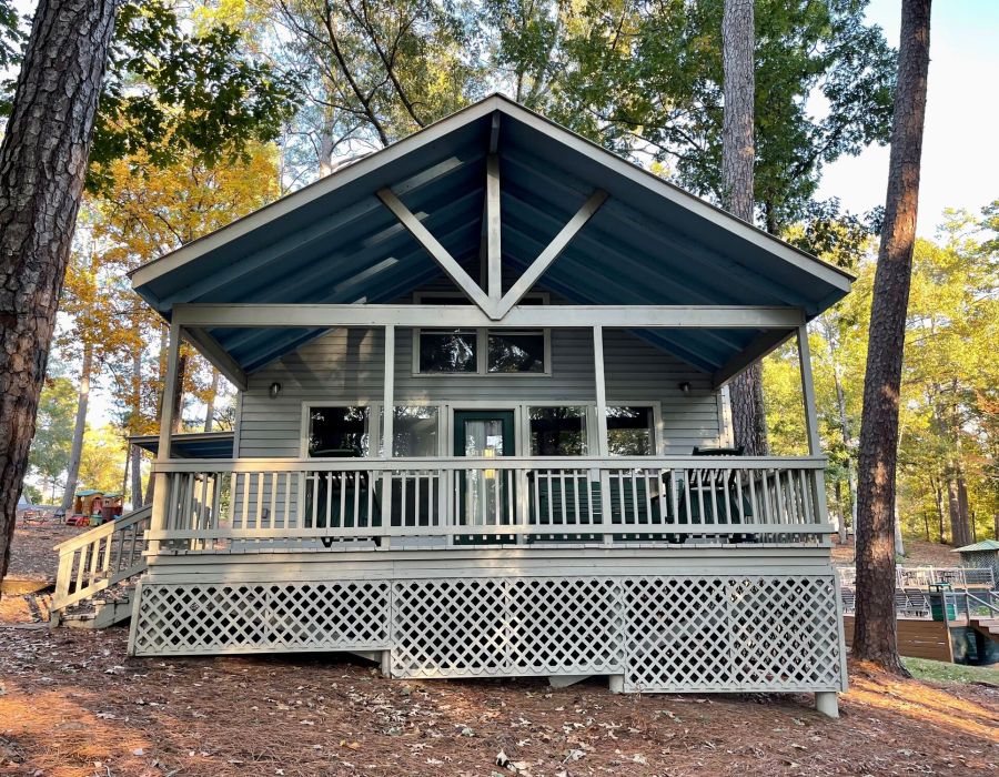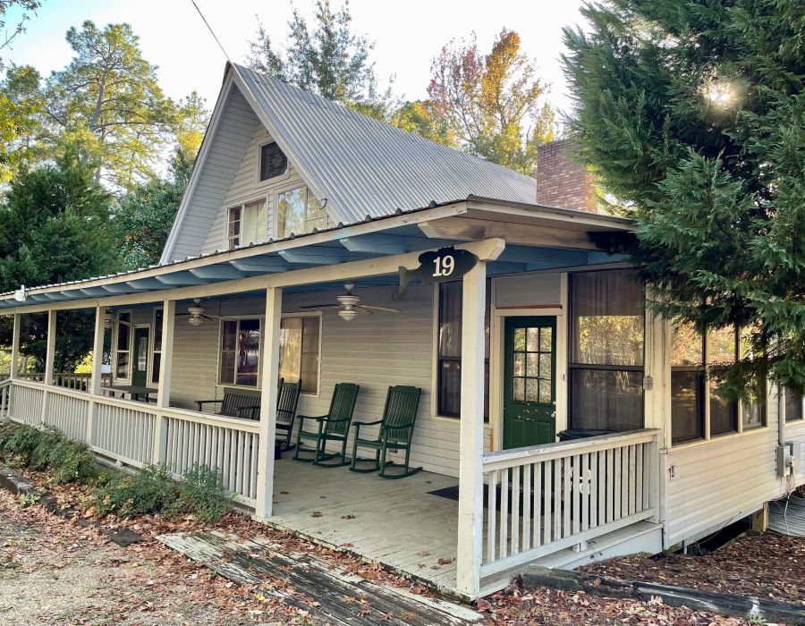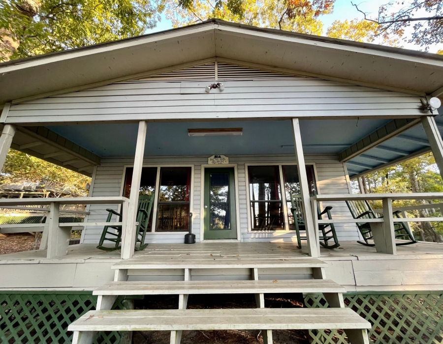 2-Bedroom lake-view cabin with full kitchen, great room, and rocking-chair porch.
