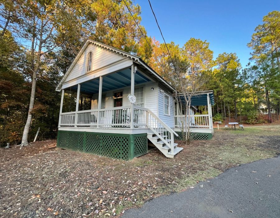 2-Bedroom cabin with queen and twin beds, full kitchen, and covered porch overlooking the pond.