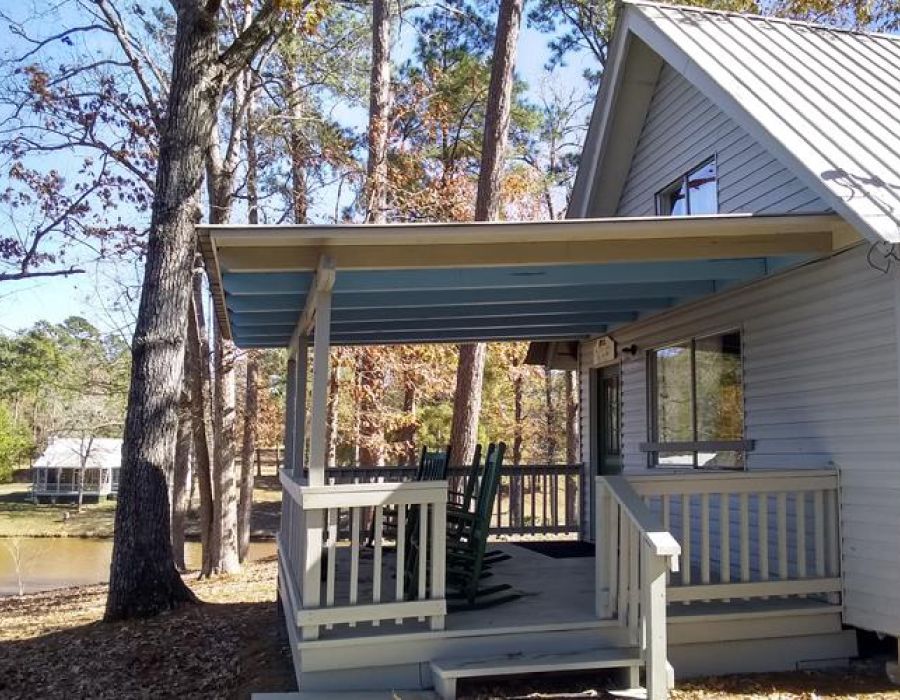2-Bedroom pondside cabin with full kitchen, great room, and covered porch with firepit.